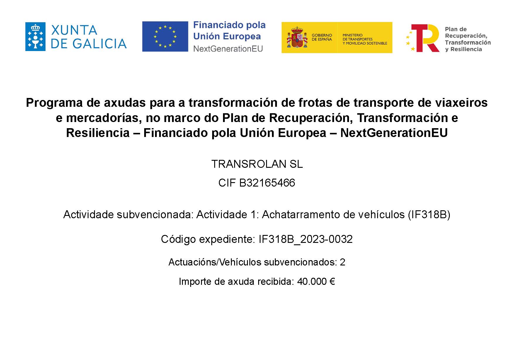 No marco do noso compromiso coa sustentabilidade e a modernización da nosa frota, TRANSROLAN S.L. adquiriu dous camións eléctricos de 16 toneladas grazas ao apoio da Xunta de Galicia e da Unión Europea, a través do Programa de axudas para a transformación de frotas de transporte de viaxeiros e mercadorías (código IF318C), no marco do Plan de recuperación, transformación e resiliencia – Financiado pola Unión Europea – Next Generation EU.